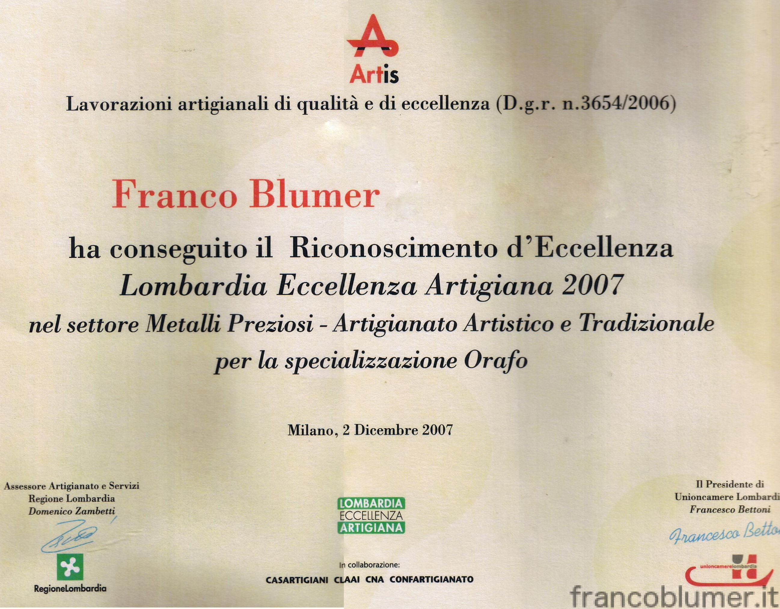 L’orafo, restauratore e cesellatore bergamasco Franco Blumer consegue il Riconoscimento d’Eccellenza “Lombardia Eccellenza Artigiana 2007” nel settore Metalli Preziosi – Artigianato Artistico e Tradizionale per la specializzazione Orafo.