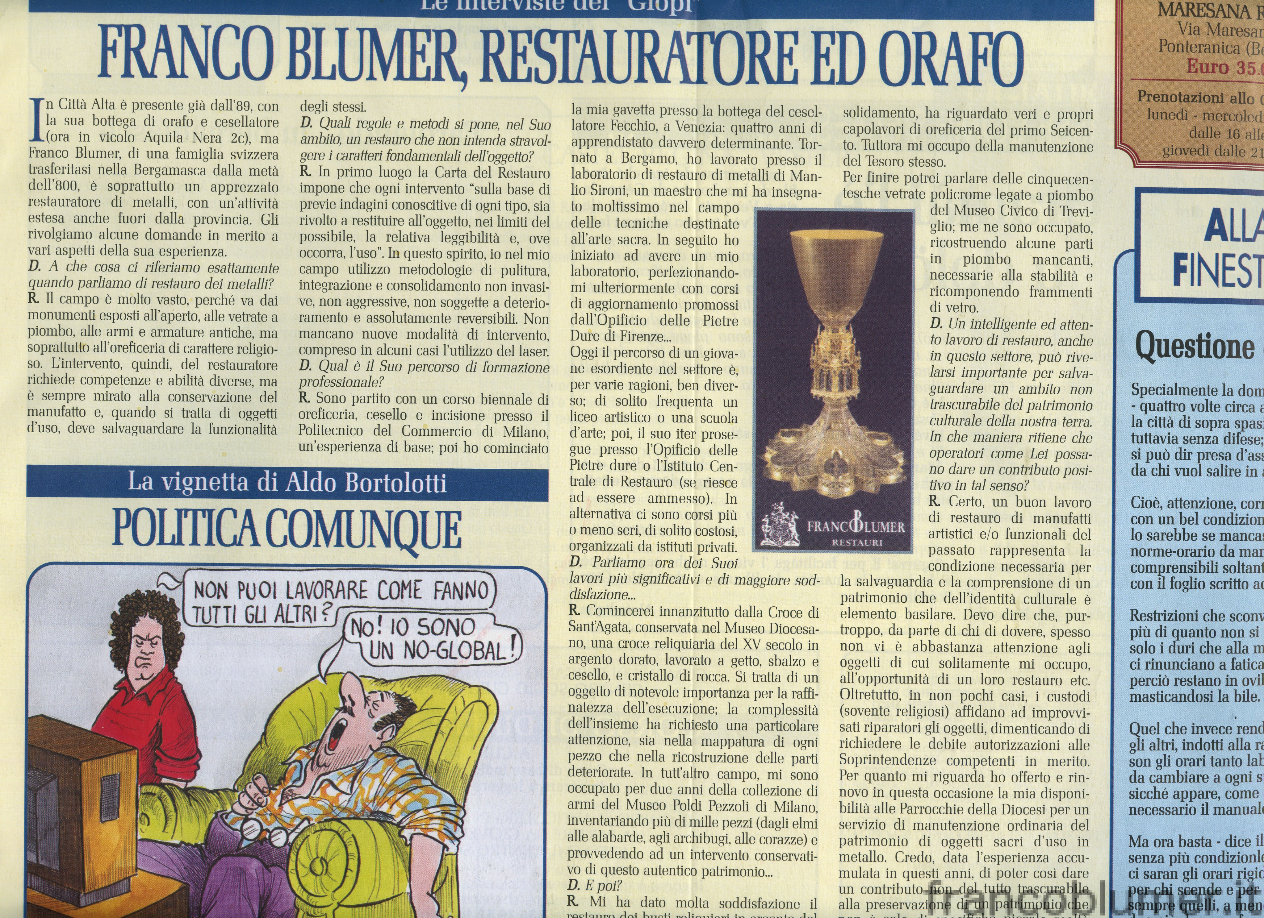 In Città Alta è presente già dell’89, con la sua bottega di orafo e cesellatore, ma Franco Blumer, di una famiglia svizzera trasferitasi nella bergamasca dalla metà dell’800, è soprattutto un apprezzato restauratore di metalli con una attività estesa anche al di fuori della provincia.