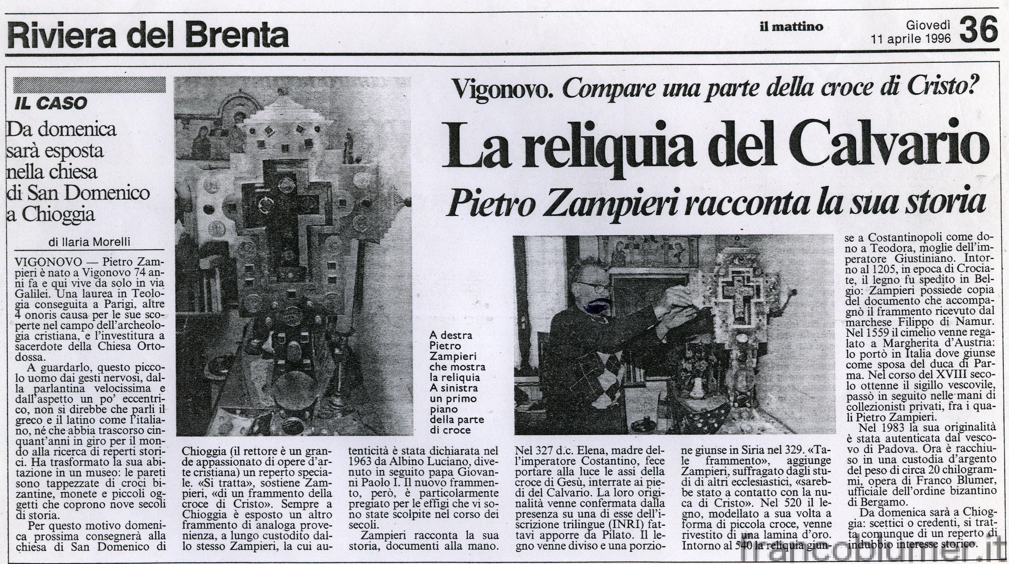 Consegnato alla chiesa di San Domenico di Chioggia un reperto speciale: un frammento della croce di Cristo, detenuto fino a quel momento da Pietro Zampieri, una laurea in Teologia conseguita a Parigi e altre 4 onoris causa per le sue scoperte nel campo dell’archeologica cristiana, oltre che l’investitura come sacerdote della Chiesa Ortodossa.