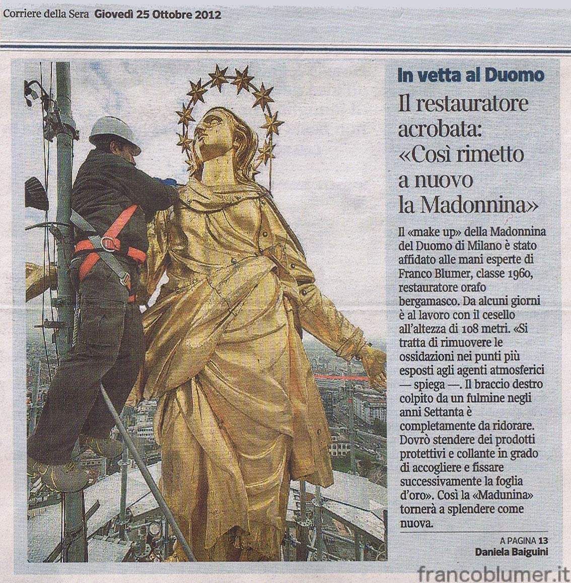 Il Corriere pubblica, il 25 ottobre 2012, un interessante articolo relativo al lifting della statua della Madonnina, sul Duomo di Milano, affidato allo specialista bergamasco Franco Blumer.
