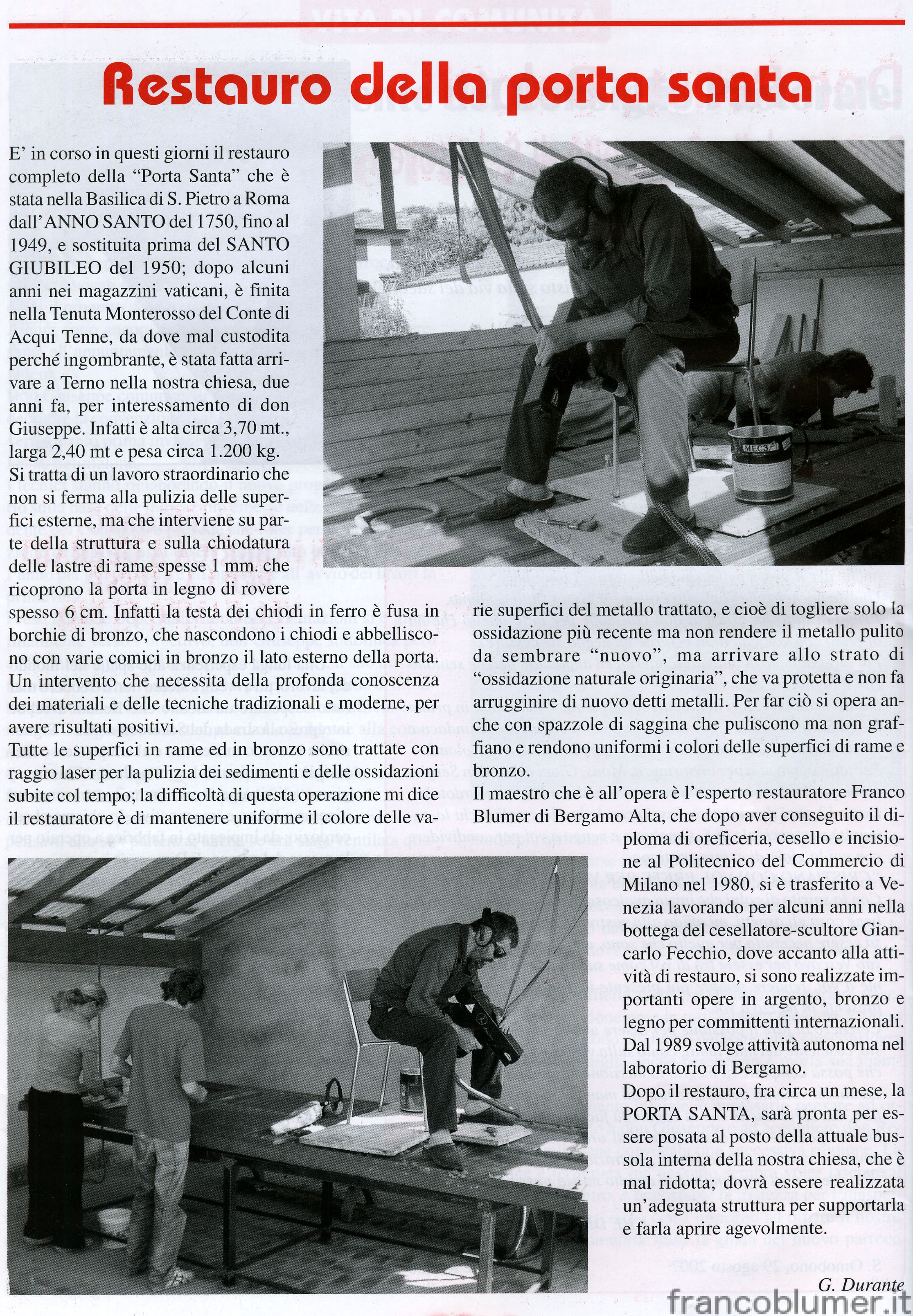 Restauro della porta santaÈ in corso in questi giorni il restauro completo della Porta Santa, che è stata nella Basilica di San Pietro a Roma dall’Anno Santo 1750 fino al 1949, e sostituita prima del Santo Giubileo del 1950.